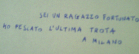 Ero in giro per la campagna alla ricerca di un buon incipit per un pezzo su Pesca alla trota in America, il romanzo di Richard Brautigan che viene ripubblicato adesso da Isbn Edizioni dopo la (s)fortunata avventura con Marcos y Marcos. Ero lì a passare al setaccio tronchi di lecci e ulivi, annusando ogni fascio d’erba e analizzando ogni pallottola di merda di pecora e ogni ruga del viso dei pastori affiliati alla Sacra Corona Unita, quando ho realizzato che l’incipit lo avevo sempre avuto sotto il naso. La copertina di Pesca alla trota in America, per la miseria. Tutto ha inizio da lì. Anche nel romanzo. C’è il buon vecchio Richard ritratto assieme alla sua musa dell’epoca, Michaela Clarke LeGrand, sullo sfondo di Washington Square a San Francisco, dove c’è la statua di Benjamin Franklin. Un romanzo che inizia facendo riferimento alla propria copertina è una cosa che dovrebbe aver già destato l’attenzione dei miei due o tre lettori, a questo punto. Adesso devo stare attento a non sciuparla. L’attenzione dei lettori è un massaggio fatto con cura da polpastrelli orientali. Devi starci attento. Non puoi sprecarla. Allora aggiungo subito che la Crociata per i Diritti di Richard Brautigan, che avevo iniziato proprio su questo blog con un’intervista all’illustratore Marco Petrella e un’altra al traduttore brautiganiano Enrico Monti, è poi proseguita con un commento minaccioso rilasciato dal sottoscritto sul blog di Isbn, in cui annunciavo di esser pronto a organizzare la lotta armata se la casa editrice in questione non avesse ristampato immediatamente Pesca alla trota. Perché vedete, il libro che negli anni ’60 ha dato il successo al buon vecchio Richard, a un certo punto della sua storia editoriale italiana è diventato introvabile, forse addirittura messo all’indice. Una sorte ben peggiore di quella riservata ai manoscritti protagonisti di un altro romanzo di Brautigan, La casa dei libri. Pare che alla Marcos y Marcos pensassero che Pesca alla trota in America contenesse troppi riferimenti alla cultura americana per esser compreso appieno in Italia. Io non so se questa è la verità. Però ho fatto in tempo a sguinzagliare un mio cugino a Milano, il quale si è intrufolato in casa editrice ed è riuscito a rintracciare «l’ultima trota a Milano», come documentato dalla foto qui sotto.