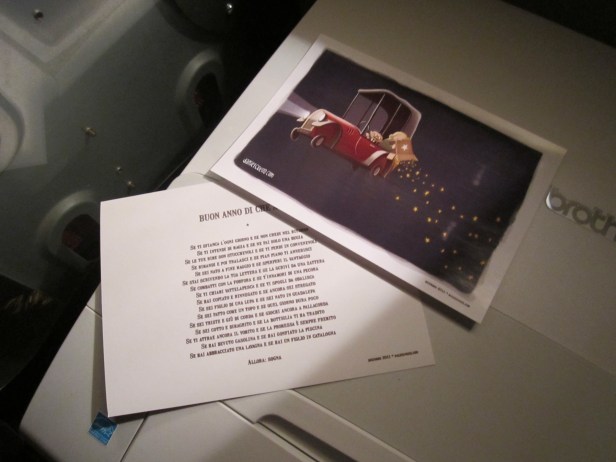Bene, anche quest’anno i lettori di questo anziano trabiccolo avranno il loro meritatissimo regalo di Natale. Per la verità siamo di fronte a un regalo di Natale/Buon Inizio. In effetti. Si tratta di una mia vecchia filastrocca intitolata Buon anno, di che anno che il disegnatore argentino Daniel Cuello ha avuto la cortesia di illustrare per me. Di questa cosa sono molto contento (grazie, Daniel!). Il risultato è una graziosa cartolina di cui vi dirò a breve – e che vedete fresca-fresca di stampa nella foto quassù, ancora adagiata, in numero di due esemplari, sulla stampante contro cui lotto quotidianamente.