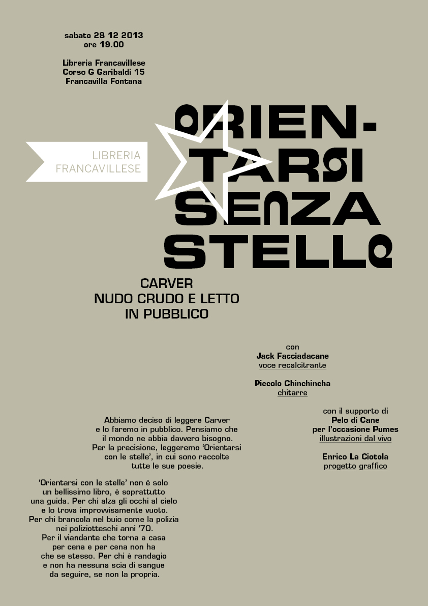 Abbiamo deciso di leggere Raymond Carver e lo faremo in pubblico. Pensiamo che il mondo ne abbia davvero bisogno. Per la precisione, leggeremo Orientarsi con le stelle, in cui sono raccolte tutte le sue poesie.